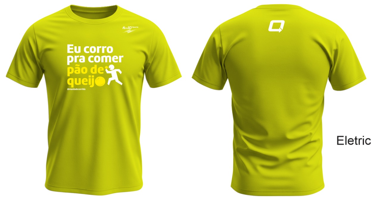 Camiseta EU CORRO PRA COMER PÃO DE QUEIJO Amarelo Flúor em Poliamida